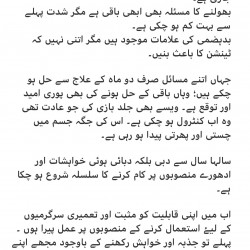 جہاں اتنے مسائل صرف دو ماہ کے علاج سے حل ہو چکے ہیں؛ وہاں باقی کے حل ہونے کی بھی پوری امید اور توقع ہے۔ ویسے بھی جلد بازی کی جو عادت تھی وہ اب کنٹرول ہو چکی ہے۔ اس کی جگہ جسم میں چستی اور پھرتی پیدا ہو رہی ہے۔