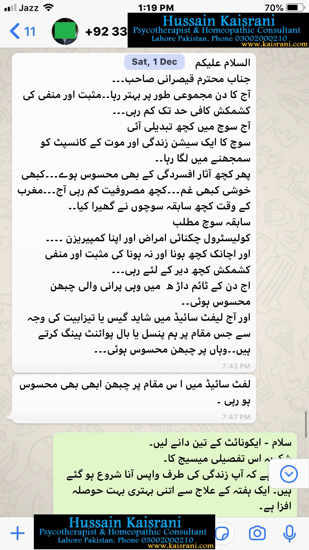 اللہ تعالی کا لاکھ لاکھ شکر گزار ہوں اور اپنے معالج کا شکریہ ادا کرتا ہوں جن کی بہت توجہ اور مسلسل آن لائن ٹریٹمنٹ اور گائیڈنس کی وجہ سے میں واپس اپنی اصل زندگی کی طرف آنے میں کامیاب ہو چکا ہوں۔۔ اپنے کاروبار کو مکمل اور بہتر انداز سے چلانا شروع کر دیا ہے۔ گھریلو معاملات بھی بہتر انداز سے ڈیل کرنے لگ گیا ہوں۔ اور حالات بہتر سے بہترین کی طرف جا رہے ہیں۔۔۔