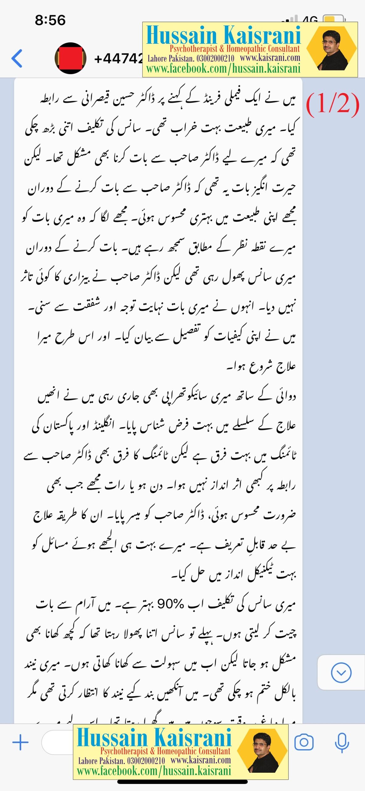 میں نے ایک فیملی فرینڈ کے کہنے پر ڈاکٹر حسین قیصرانی سے رابطہ کیا۔ میری طبیعت بہت خراب تھی۔ سانس کی تکلیف اتنی بڑھ چکی تھی کہ میرے لیے ڈاکٹر صاحب سے بات کرنا بھی مشکل تھا۔ لیکن حیرت انگیز بات یہ تھی کہ ڈاکٹر صاحب سے بات کرنے کے دوران مجھے اپنی طبیعت میں بہتری محسوس ہوئی۔ مجھے لگا کہ وہ میری بات کو میرے نقطہ نظر کے مطابق سمجھ رہے ہیں۔ بات کرنے کے دوران میری سانس پھول رہی تھی لیکن ڈاکٹر صاحب نے بیزاری کا کوئی تاثر نہیں دیا۔ انہوں نے میری بات نہایت توجہ اور شفقت سے سنی۔ میں نے اپنی کیفیات کو تفصیل سے بیان کیا۔ اور اس طرح میرا علاج شروع ہوا۔