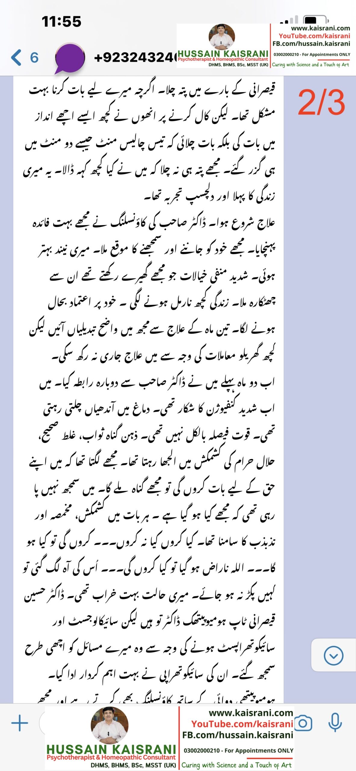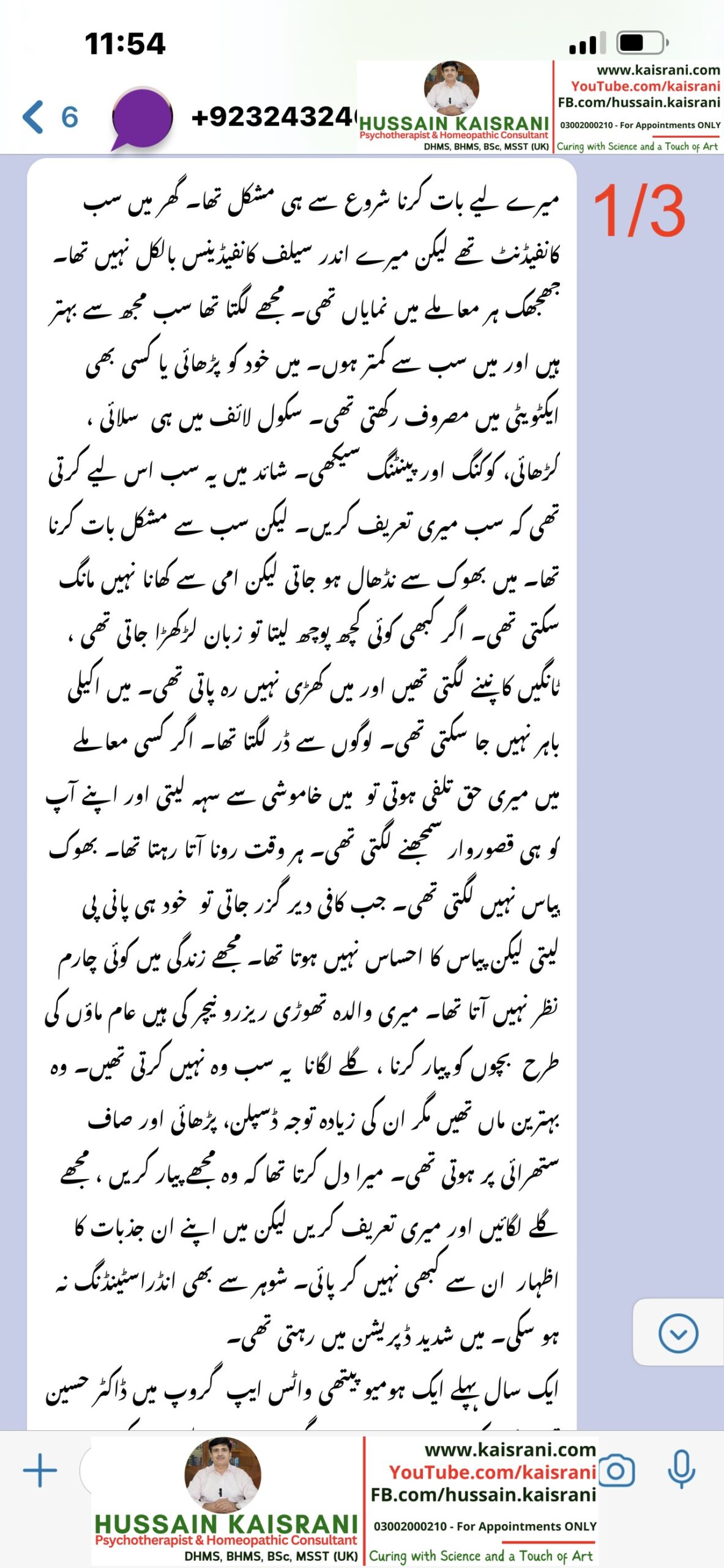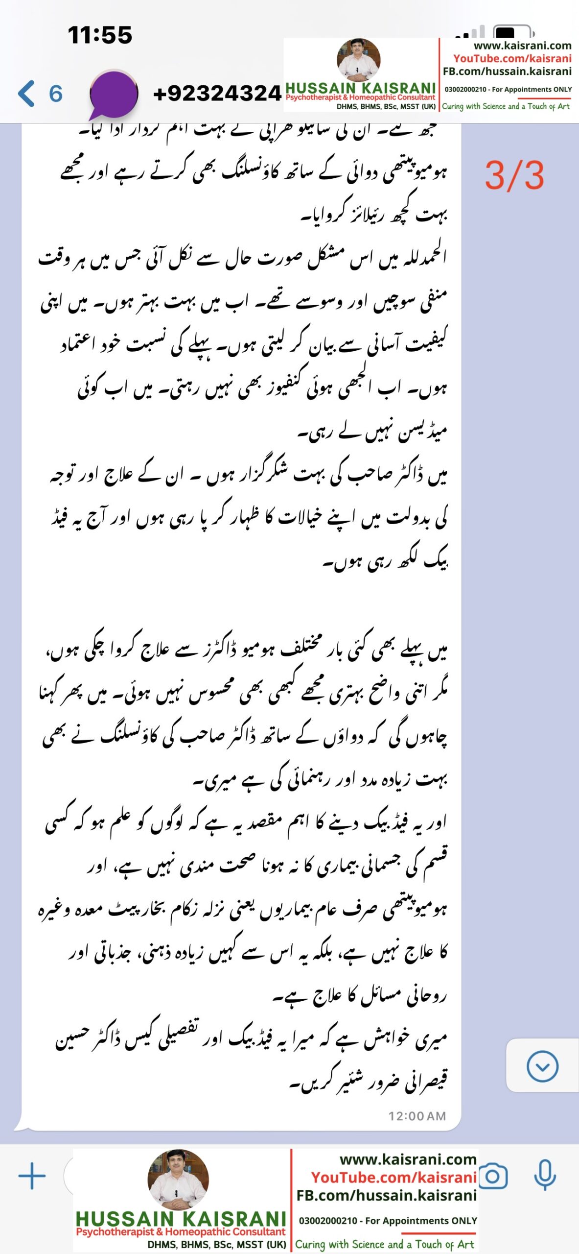 میں پہلے بھی کئی بار مختلف ہومیو ڈاکٹرز سے علاج کروا چکی ہوں، مگر اتنی واضح بہتری مجھے کبھی بھی محسوس نہیں ہوئی۔ میں پھر کہنا چاہوں گی کہ دواؤں کے ساتھ ڈاکٹر صاحب کی کاؤنسلنگ نے بھی بہت زیادہ مدد اور رہنمائی کی ہے میری۔