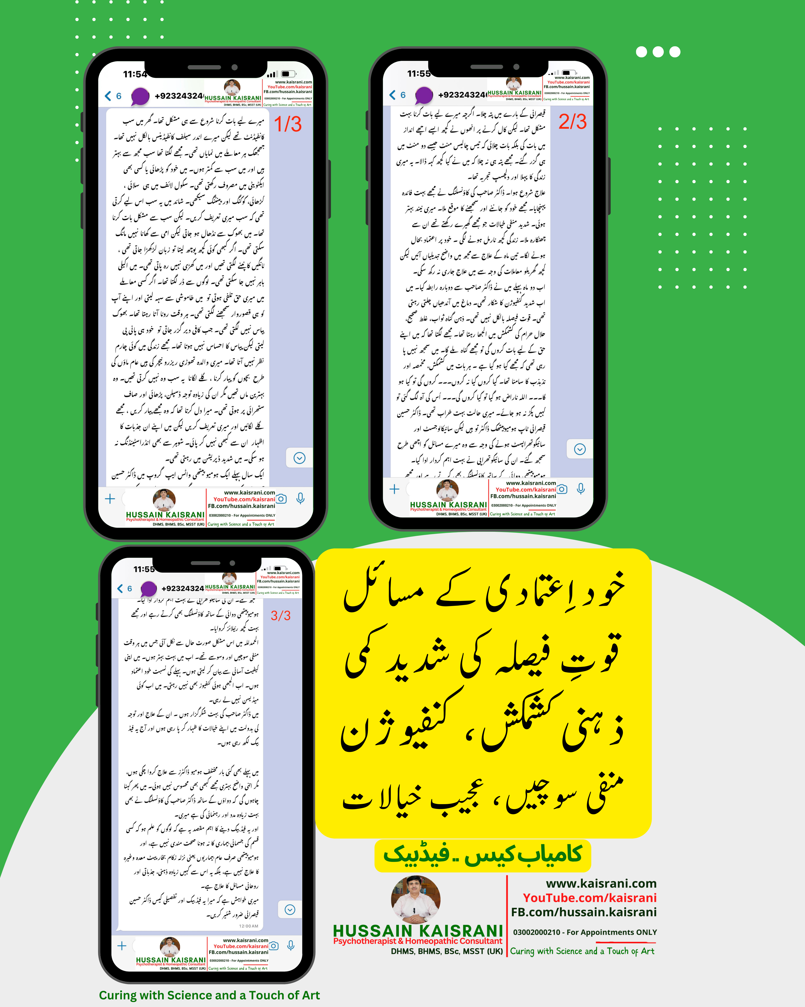 اب دو ماہ پہلے میں نے ڈاکٹر صاحب سے دوبارہ رابطہ کیا۔ میں اب شدید کنفیوژن (Confusion of mind) کا شکار تھی۔ دماغ میں آندھیاں چلتی رہتی تھی۔ قوت فیصلہ بالکل نہیں تھی۔ ذہن گناہ ثواب، غلط صحیح، حلال حرام کی کشمکش میں الجھا رہتا تھا۔ مجھے لگتا تھا کہ میں اپنے حق کے لیے بات کروں گی تو مجھے گناہ ملے گا۔ میں سمجھ نہیں پا رہی تھی کہ مجھے کیا ہو گیا ہے ۔ ہر بات میں کشمکش، مخمصہ اور تذبذب کا سامنا تھا۔ کیا کروں کیا نہ کروں۔۔۔ کروں گی تو کیا ہو گا۔۔۔ اللہ ناراض ہو گیا تو کیا کروں گی۔۔۔ اُس کی آہ لگ گئی تو کہیں پکڑ نہ ہو جائے۔ میری حالت بہت خراب تھی۔ ڈاکٹر حسین قیصرانی ٹاپ ہومیوپیتھک ڈاکٹر تو ہیں لیکن سائیکالوجسٹ (Psychologist) اور سائیکوتھراپسٹ (Psychotherapist) ہونے کی وجہ سے وہ میرے مسائل کو اچھی طرح سمجھ گئے۔ ان کی سائیکوتھراپی نے بہت اہم کردار ادا کیا۔ ہومیوپیتھی دوائی کے ساتھ کاؤنسلنگ بھی کرتے رہے اور مجھے بہت کچھ رئیلائز کروایا۔