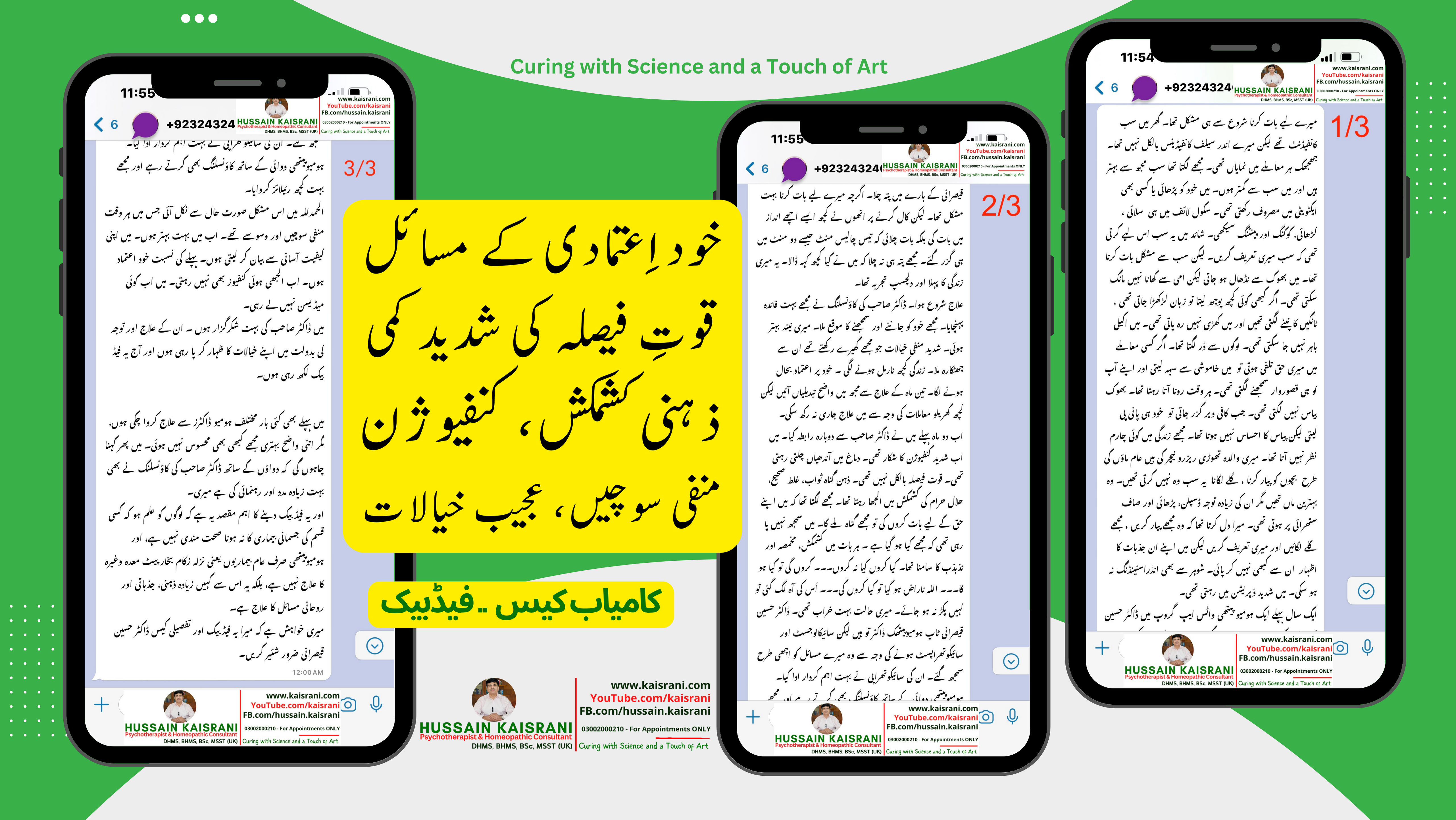 الحمدللہ میں اس مشکل صورت حال سے نکل آئی جس میں ہر وقت منفی سوچیں (Negative Thoughts) اور وسوسے تھے۔ اب میں بہت بہتر ہوں۔ میں اپنی کیفیت آسانی سے بیان کر لیتی ہوں۔ پہلے کی نسبت خود اعتماد ہوں۔ اب الجھی ہوئی کنفیوز (Double Minded) بھی نہیں رہتی۔ میں اب کوئی میڈیسن نہیں لے رہی۔