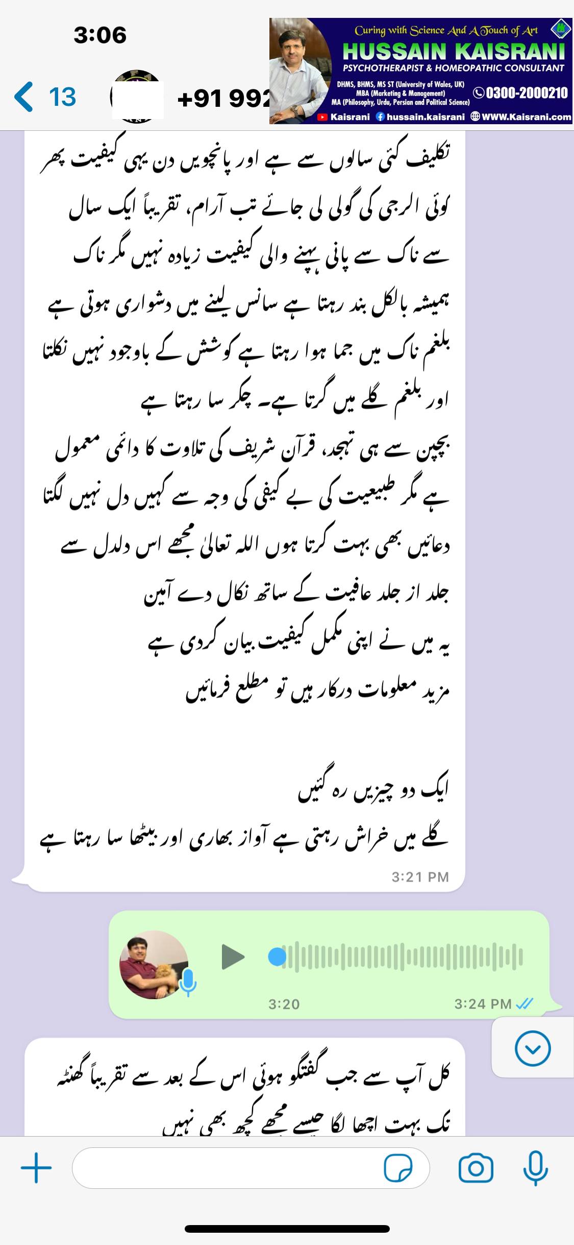 نزلہ زکام بہت زیادہ رہتا ہے۔ گرد و غبار ، تبدیلی موسم اور سرد غذاؤں کے استعمال سے ناک سے پانی اس قدر بہتا ہے جیسے نل کھول دیا گیا ہو اور ساتھ ساتھ چھینکیں۔ یہ تکلیف کئی سالوں سے ہے اورہر پانچویں دن یہی کیفیت پھر کوئی الرجی کی گولی لی جائے تب وقتی آرام۔ تقریباً ایک سال سے ناک سے پانی بہنے والی کیفیت زیادہ نہیں مگر اب ناک ہمیشہ بالکل بند رہتی ہے ۔سانس لینے میں دشواری ہوتی ہے ۔بلغم ناک میں جما ہوا رہتا ہے ۔کوشش کے باوجود نہیں نکلتا اور بلغم گلے میں گرتا ہے۔ چکر سا محسوس ہوتا رہتا ہے۔ گلے میں خراش رہتی ہے۔ آواز بھاری ہو جاتی ہے۔ منہ میں چھالے بن جاتے ہیں اور کھانا پینا مشکل ہو جاتا ہے۔