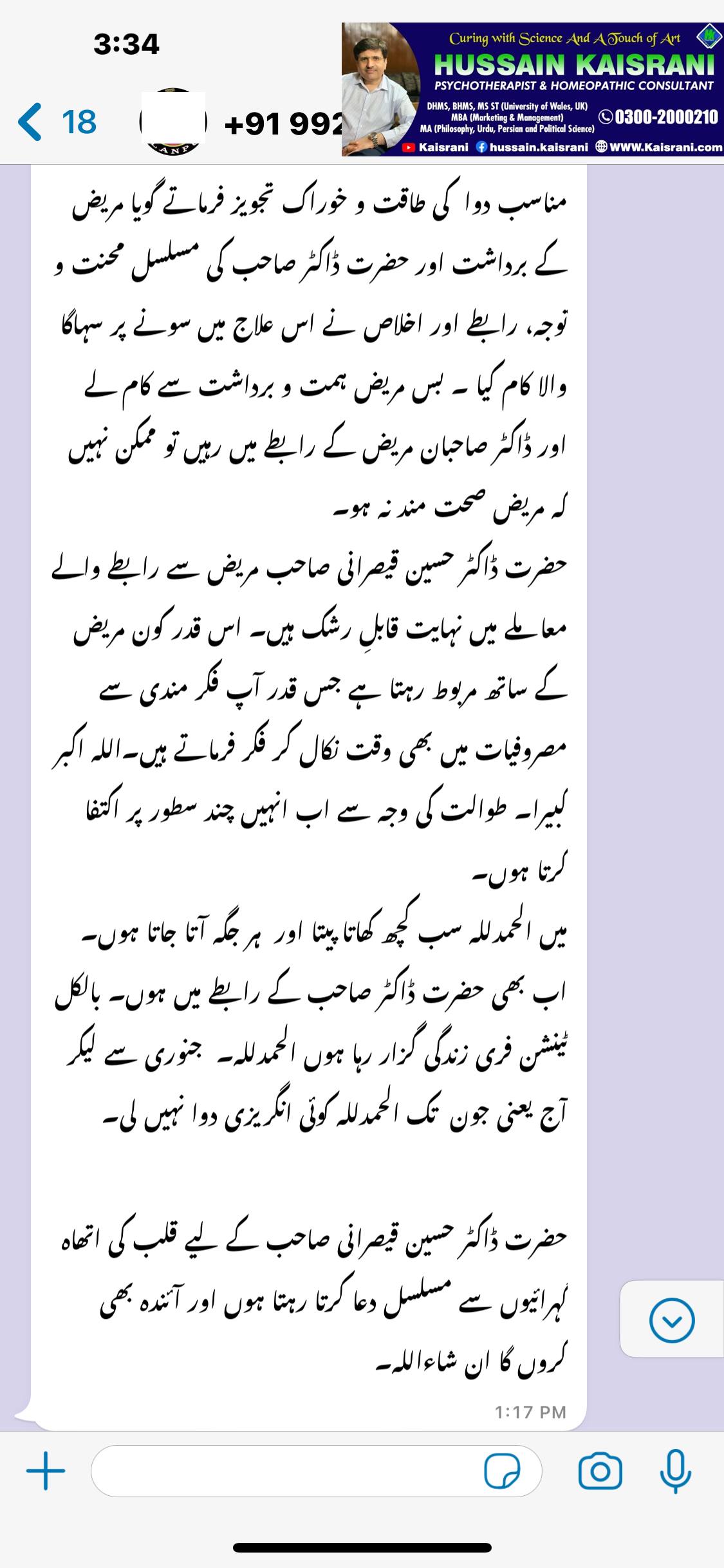 چند ماہ قبل علامہ صاحب نے واٹس ایپ پر رابطہ کیا۔ وہ فیس بک پر مختلف کیسز کا مطالعہ کر چکے تھے اور اپنے پیچیدہ مسائل کے بارے میں بات کر نا چاہتے تھے۔ علامہ صاحب کے مسائل پریشان کن تھے جس کی وجہ سے ان کی روزمرہ زندگی کے معمولات خاصے ڈسٹرب تھے۔ کئی طرح کے ڈر، خوف، فوبیاز، خاص طور پر موت بلکہ ہارٹ اٹیک کی وجہ سےموت کا خوف حواس پر دن رات طاری رہتا تھا۔ منتشر دماغ، منفی خیالات ، شدید سر درد، پرسکون نیند کی عدم موجودگی، منہ کے دانے چھالےالسر، گلے میں ریشہ کیرا گرنا، چھینکیں، فوڈ الرجی (Food Allergy)، تیزابیت، معدے کے مسائل ، ڈپریشن ، انگزائٹی، پینک اٹیک اور اس جیسے کئی مسائل نے انھیں گھیر رکھا تھا۔ ڈسٹ الرجی بہت زیادہ تھی۔ شدید بلکہ دائمی نزلہ زکام الرجی کوئی بھی کام خوش اسلوبی سے کرنے کی راہ میں رکاوٹ بنا رہتا تھا۔ بہت ساری ادویات زیرِ استعمال رہتی تھیں۔