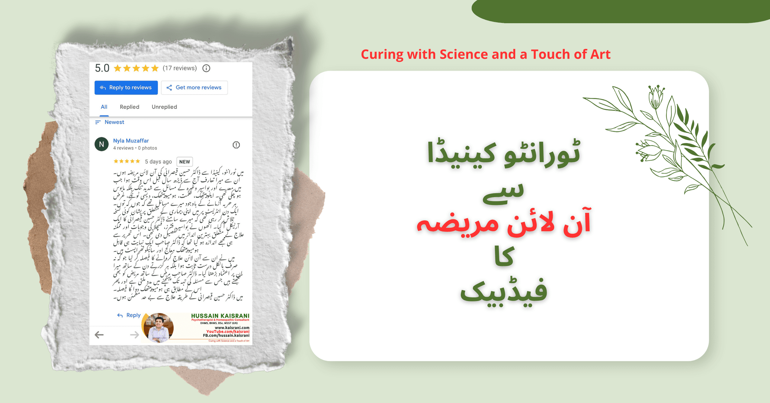 میں نے ان سے آن لائن علاج کروانے کا فیصلہ کر لیا جو کہ نہ صرف بالکل درست ثابت ہوا بلکہ ہر گزرتے دن کے ساتھ میرا ان پر اعتماد بڑھتا گیا۔ ڈاکٹر صاحب مرض کے ساتھ مریض کو بھی سمجھتے ہیں جس سے مسئلہ کی تہہ تک پہنچنے میں مدد ملتی ہے اور پھر اس کے مطابق ہی ہومیوپیتھک دوا کا فیصلہ۔